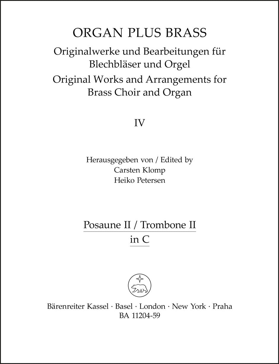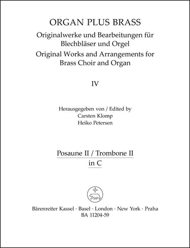 **Title**: organ plus brass, Band IV: Cathedral Sounds | **Misc Information**: Arrangements for brass choir and organ | **Composer / Author**: Stanford, Charles Villiers | **Arranger**: Klomp, Carsten | **Editor**: Klomp, Carsten / Petersen, Heiko | **Preface**: Klomp, Carsten / Petersen, Heiko | **Edition Type**: Part | **Scoring/ Instrumentation**: 2. Trombone | **Binding**: Stapled | **Level of Difficulty**: 3.0 | **Weight**: 28.0 g | **Format**: 30,0 x 23,0 cm | **Pages**: 5 S. | **Language**: EN | Sample: https://data.baerenreiter.com/NB/BA/BA11204_59_9790006558674_nb_lrg_01.jpg