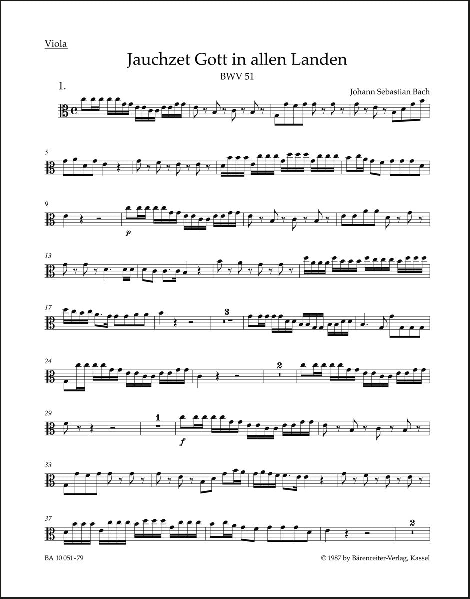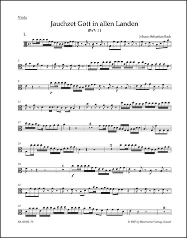 **Title**: Praise ye God thruout creation BWV 51 | **Subtitle**: Cantata for the 15th Sunday after Trinity | **Comments on Version**: Study score = TP 1051 | **Composer / Author**: Bach, Johann Sebastian | **Editor**: Wendt, Matthias | **Edition Type**: Part, Urtext edition | **Scoring/ Instrumentation**: Viola | **Binding**: Folded | **Weight**: 16.0 g | **Format**: 32,5 x 25,5 cm | **Pages**: 4 S. | **Language**: EN | Sample: https://data.baerenreiter.com/NB/BA/BA10051_79_9790006537990_nb_lrg_01.jpg