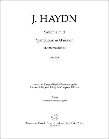 **Title**: Symphony in D minor Hob. I:26 "Lamentazione" | **Comments on Version**: Urtext from: Henle Complete Edition of the Works of Joseph Haydn | **Composer / Author**: Haydn, Joseph | **Editor**: Friesenhagen, Andreas / Heitmann, Christin | **Edition Type**: Part, Urtext edition | **Scoring/ Instrumentation**: Basso (Violoncello, Violone, Bassoon) | **Binding**: Stapled | **Weight**: 34.0 g | **Format**: 32,5 x 25,5 cm | **Pages**: 5 S. | **Language**: EN | Sample: https://data.baerenreiter.com/NB/BA/BA10975_82_9790006558926_nb_lrg_01.jpg