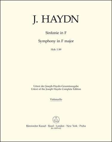 **Title**: Symphony in F major Hob. I:89 | **Comments on Version**: Urtext from the Henle Complete Edition of the Works of Joseph Haydn | **Composer / Author**: Haydn, Joseph | **Editor**: Friesenhagen, Andreas | **Edition Type**: Part, Urtext edition | **Scoring/ Instrumentation**: Violoncello | **Binding**: Stapled | **Weight**: 33.0 g | **Format**: 32,5 x 25,5 cm | **Pages**: 7 S. | **Language**: EN | Sample: https://data.baerenreiter.com/NB/BA/BA10979_82_9790006562824_nb_lrg_01.jpg