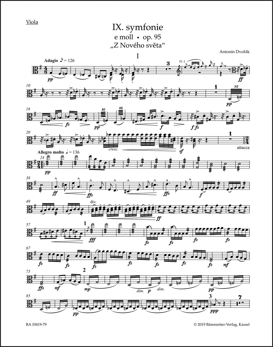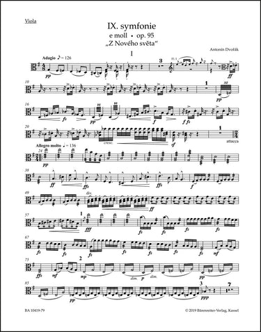 **Title**: Symphony no. 9 in E minor op. 95 "New World" | **Composer / Author**: Dvorak, Antonin | **Editor**: Del Mar, Jonathan | **Edition Type**: Part, Urtext edition | **Scoring/ Instrumentation**: Viola | **Binding**: Stapled | **Weight**: 65.0 g | **Format**: 32,5 x 25,5 cm | **Pages**: 14 S. | **Language**: EN | Sample: https://data.baerenreiter.com/NB/BA/BA10419_79_9790006564750_nb_lrg_01.jpg