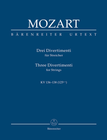 **Title**: Three Divertimenti for Strings K. 136-138 (125a-c) | **Composer / Author**: Mozart, Wolfgang Amadeus | **Editor**: Füssl, Karl Heinz | **Preface**: Füssl, Karl Heinz | **Edition Type**: Study score, Urtext edition, Anthology | **Binding**: Stapled | **Printing**: 13th printing 2023 | **Weight**: 108.0 g | **Format**: 22,5 x 16,5 cm | **Pages**: VII, 38 S. | **Language**: EN | Sample: https://data.baerenreiter.com/NB/TP/TP00278_00_9790006202423_nb_lrg_01.jpg