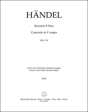 **Title**: Concerto in F major HWV 331 | **Composer / Author**: Handel, George Frideric | **Editor**: Best, Terence | **Edition Type**: Part, Urtext edition | **Scoring/ Instrumentation**: Basses | **Binding**: Stapled | **Weight**: 16.0 g | **Format**: 32,5 x 25,5 cm | **Pages**: 3 S. | **Language**: EN | Sample: https://data.baerenreiter.com/NB/BA/BA10252_82_9790006538829_nb_lrg_01.jpg