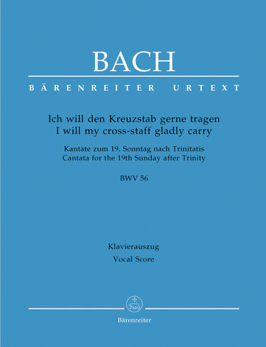 **Title**: I will my cross-staff gladly carry BWV 56 "Cross Staff Cantata (Kreuzstabkantate)" | **Subtitle**: Cantata for the 19th Sunday after Trinity | **Comments on Version**: Study score = TP 1056 | **Composer / Author**: Bach, Johann Sebastian | **Arranger**: Kroupová, Olga | **Editor**: Wendt, Matthias | **Edition Type**: Vocal Score, Urtext edition | **Binding**: Stapled | **Level of Difficulty**: 4.0 | **Duration**: 00:21:00 | **Printing**: 5th printing 2020 | **Language of Text Part**: German, English | **Weight**: 79.0 g | **Format**: 27,0 x 19,0 cm | **Pages**: 20 S. | **Language**: EN | Sample: https://data.baerenreiter.com/NB/BA/BA10056_90_9790006503346_nb_lrg_01.jpg