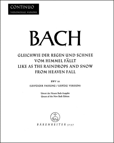**Title**: Like as the Raindrops and Snow from Heaven fall BWV 18 | **Subtitle**: Cantata for Sunday Sexagesimae | **Misc Information**: Leipzig Version | **Comments on Version**: Study score = TP 1018 | **Composer / Author**: Bach, Johann Sebastian | **Editor**: Neumann, Werner | **Edition Type**: Part, Urtext edition | **Scoring/ Instrumentation**: Violoncello, Double bass | **Binding**: Stapled | **Weight**: 84.0 g | **Format**: 32,5 x 25,5 cm | **Pages**: 7 S. | **Language**: EN | Sample: https://data.baerenreiter.com/NB/BA/BA10018_86_9790006490004_nb_lrg_01.jpg
