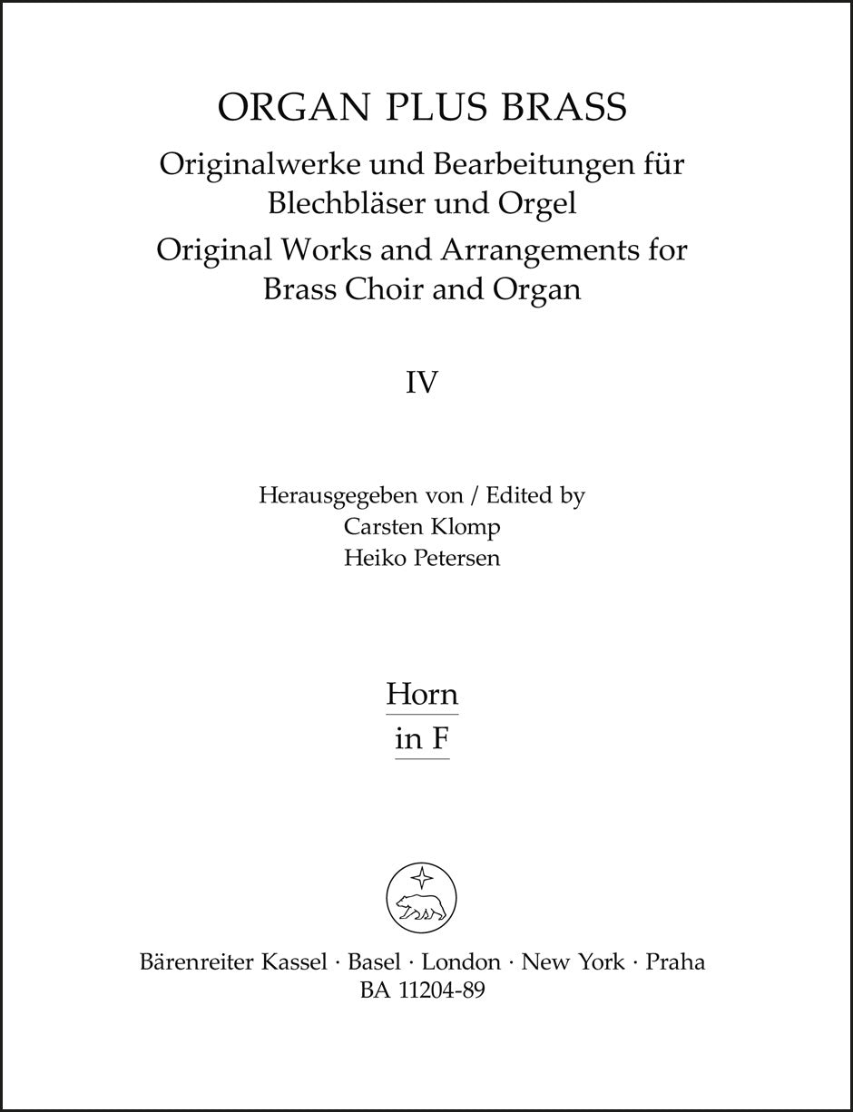 **Title**: organ plus brass, Band IV: Cathedral Sounds | **Misc Information**: Arrangements for brass choir and organ | **Composer / Author**: Stanford, Charles Villiers | **Arranger**: Klomp, Carsten | **Editor**: Klomp, Carsten / Petersen, Heiko | **Preface**: Klomp, Carsten / Petersen, Heiko | **Edition Type**: Part | **Scoring/ Instrumentation**: Horn | **Binding**: Stapled | **Level of Difficulty**: 3.0 | **Weight**: 28.0 g | **Format**: 30,0 x 23,0 cm | **Pages**: 5 S. | **Language**: EN | Sample: https://data.baerenreiter.com/NB/BA/BA11204_89_9790006558681_nb_lrg_01.jpg