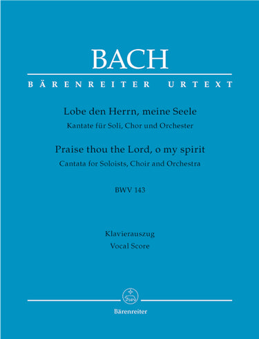 **Title**: Praise thou the Lord, o my spirit BWV 143 | **Subtitle**: Cantata for soloists, choir and orchestra | **Misc Information**: Urtext of the New Bach Edition - Revised Edition | **Composer / Author**: Bach, Johann Sebastian | **Arranger**: Köhs, Andreas | **Editor**: Glöckner, Andreas | **Preface**: Glöckner, Andreas | **Edition Type**: Vocal Score, Urtext edition | **Binding**: Stapled | **Printing**: 1st printing 2012 | **Language of Text Part**: German, English | **Weight**: 96.0 g | **Format**: 27,0 x 19,0 cm | **Pages**: IV, 23 S. | **Language**: EN | Sample: https://data.baerenreiter.com/NB/BA/BA10143_90_9790006542413_nb_lrg_01.jpg