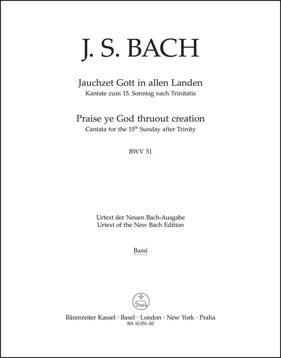 **Title**: Praise ye God thruout creation BWV 51 | **Subtitle**: Cantata for the 15th Sunday after Trinity | **Comments on Version**: Study score = TP 1051 | **Composer / Author**: Bach, Johann Sebastian | **Editor**: Wendt, Matthias | **Edition Type**: Part, Urtext edition | **Scoring/ Instrumentation**: Basses | **Binding**: Stapled | **Weight**: 49.0 g | **Format**: 32,5 x 25,5 cm | **Pages**: 10 S. | **Language**: EN | Sample: https://data.baerenreiter.com/NB/BA/BA10051_82_9790006539161_nb_lrg_01.jpg