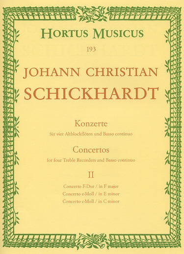 **Title**: Sechs Konzerte für 4 Altblockflöten und Basso continuo | **Subtitle**: Konzerte F-dur, e-moll und c-moll | **Misc Information**: Heft 2 | **Composer / Author**: Schickhardt, Johann Christian | **Editor**: Knab, Richard, Valentin | **Edition Type**: Performance score, Set of parts | **Instrumentation**: Recorder, Basso continuo | **Scoring/ Instrumentation**: Treble recorders (4), Basso continuo | **Binding**: Paperback | **Level of Difficulty**: 3.0 | **Printing**: 14. Aufl. 2022 | **Weight**: 375.0 g | **Format**: 30,0 x 23,0 cm | **Pages**: 44/12/12/10/9/11 | **Language**: EN | Sample: https://data.baerenreiter.com/NB/HM/HM00193_00_9790006003853_nb_lrg_01.jpg
