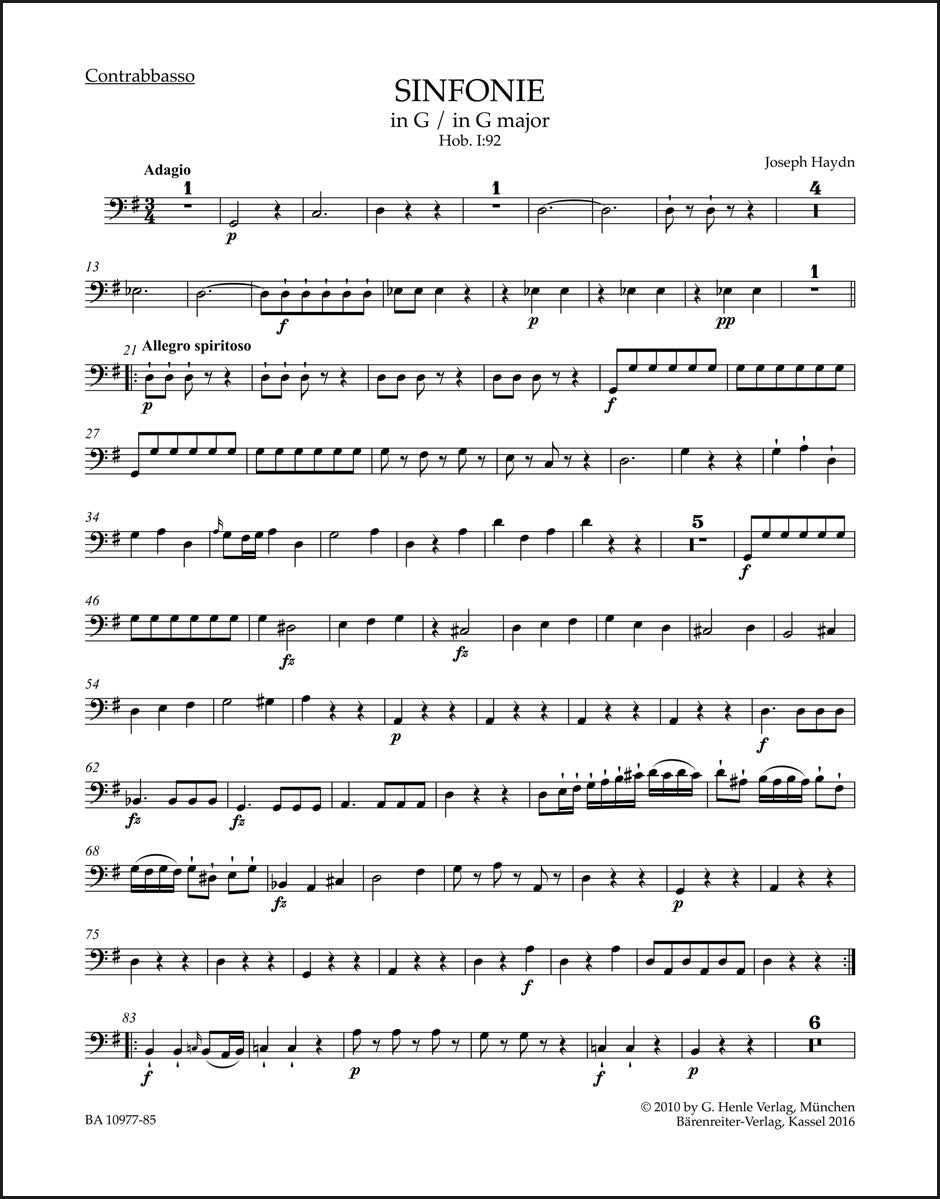 **Title**: Symphony in G major Hob. I:92 "Oxford" | **Comments on Version**: Urtext from the Henle Complete Edition of the Works of Joseph Haydn | **Composer / Author**: Haydn, Joseph | **Editor**: Friesenhagen, Andreas | **Edition Type**: Part, Urtext edition | **Scoring/ Instrumentation**: Double bass | **Binding**: Stapled | **Weight**: 50.0 g | **Format**: 32,5 x 25,5 cm | **Pages**: 9 S. | **Language**: EN | Sample: https://data.baerenreiter.com/NB/BA/BA10977_85_9790006562534_nb_lrg_01.jpg