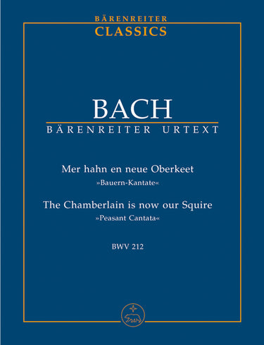 **Title**: The Chamberlain is now our Squire BWV 212 "Peasant Cantata" | **Comments on Version**: Parts and Vocal score = BA 10212 | **Composer / Author**: Bach, Johann Sebastian | **Editor**: Neumann, Werner | **Edition Type**: Study score, Urtext edition | **Instrumentation**: Soloists, Orchestra, Basso continuo | **Binding**: Stapled | **Level of Difficulty**: 3.0 | **Printing**: 1st printing 2006 | **Weight**: 93.0 g | **Format**: 22,5 x 16,5 cm | **Pages**: VII, 35 S. | **Language**: EN | Sample: https://data.baerenreiter.com/NB/TP/TP01212_00_9790006204786_nb_lrg_01.jpg