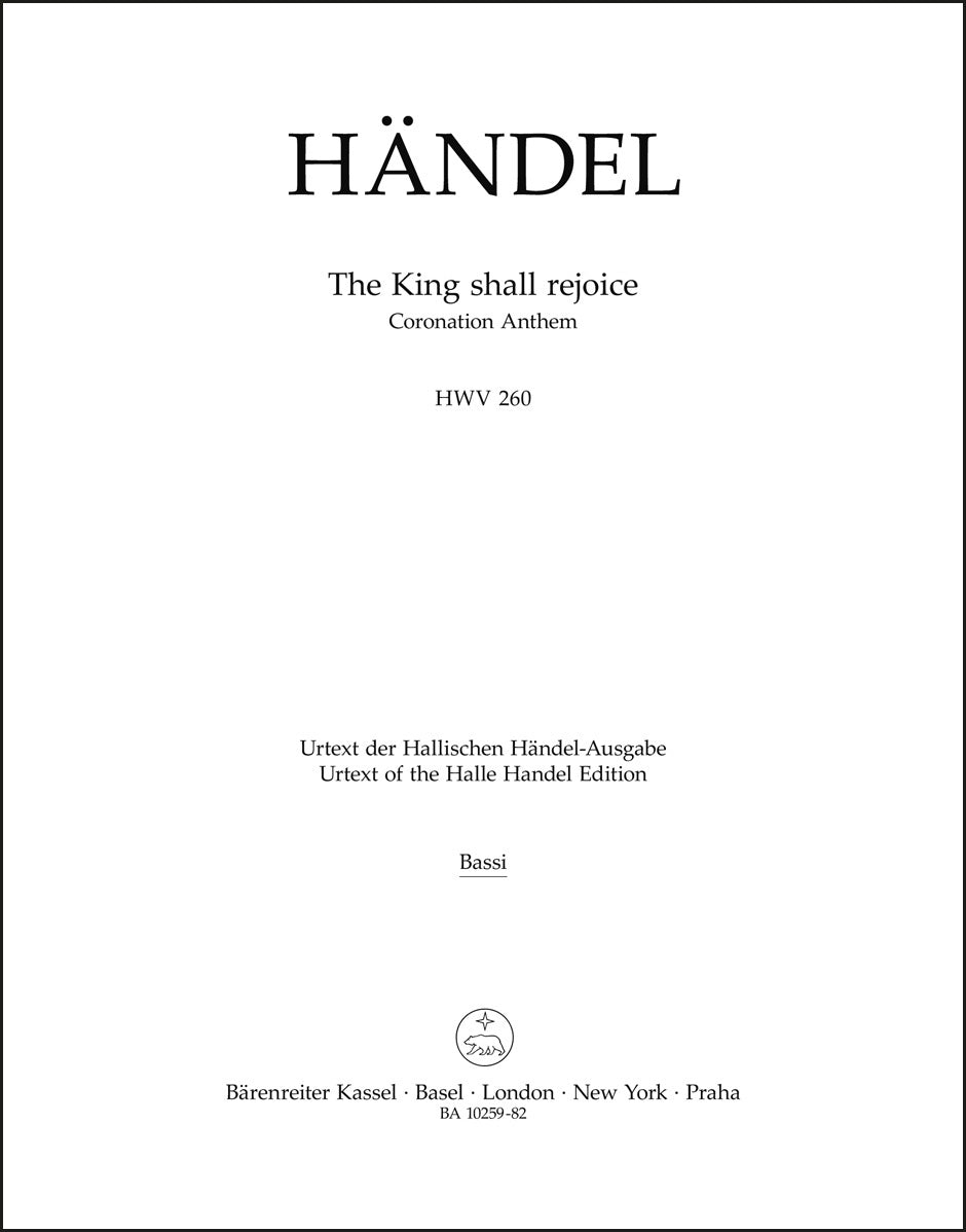 **Title**: The King shall rejoice HWV 260 | **Subtitle**: Coronation Anthem | **Composer / Author**: Handel, George Frideric | **Editor**: Blaut, Stephan | **Edition Type**: Part, Urtext edition | **Scoring/ Instrumentation**: Basses | **Binding**: Stapled | **Weight**: 33.0 g | **Format**: 32,5 x 25,5 cm | **Pages**: 7 S. | **Language**: EN | Sample: https://data.baerenreiter.com/NB/BA/BA10259_82_9790006562336_nb_lrg_01.jpg