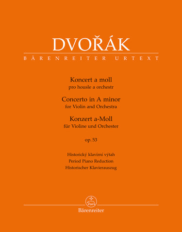 **Title**: Concerto for Violin and Orchestra in A minor op. 53 | **Comments**: Replaces H 1005 | **Comments on Version**: The Critical Commentary to this edition can be downloaded for free at https:// https://www.baerenreiter.com/en/shop/product/details/BA10422-90/ (Extras) | **Composer / Author**: Dvorak, Antonin | **Editor**: Cividini, Iacopo | **Preface**: Cividini, Iacopo | **Edition Type**: Piano reduction, Part, Urtext edition | **Instrumentation**: Violin, Orchestra | **Scoring/ Instrumentation**: Violin, Piano | **Binding**: Stapled | **Level of Difficulty**: 4.0 | **Printing**: 1st printing 2017 | **Weight**: 370.0 g | **Format**: 31,0 x 24,3 cm | **Pages**: XXIII, 39/20 S. | **Language**: EN | Sample: https://data.baerenreiter.com/NB/BA/BA10422_90_9790260107687_nb_lrg_01.jpg