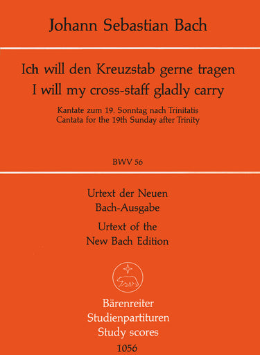 **Title**: I will my cross-staff gladly carry BWV 56 "Cross Staff Cantata (Kreuzstabkantate)" | **Subtitle**: Cantata for the 19th Sunday after Trinity | **Comments on Version**: Parts and Vocal Score = BA 10056 | **Composer / Author**: Bach, Johann Sebastian | **Editor**: Wendt, Matthias | **Edition Type**: Study score, Urtext edition | **Binding**: Stapled | **Duration**: 00:21:00 | **Weight**: 64.0 g | **Format**: 22,5 x 16,5 cm | **Pages**: 27 S. | **Language**: EN | Sample: https://data.baerenreiter.com/NB/TP/TP01056_00_9790006204106_nb_lrg_01.jpg