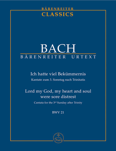 **Title**: Lord my God, my heart and soul were sore distrest BWV 21 | **Subtitle**: Cantata for the 3rd Sunday after Trinity | **Comments on Version**: Vocal Score and Parts = BA 10021 | **Composer / Author**: Bach, Johann Sebastian | **Editor**: Brainard, Paul | **Edition Type**: Study score, Urtext edition | **Binding**: Paperback | **Level of Difficulty**: 3.0 | **Printing**: 1st printing 2009 | **Weight**: 180.0 g | **Format**: 22,5 x 16,5 cm | **Pages**: VIII, 86 S. | **Language**: EN | Sample: https://data.baerenreiter.com/NB/TP/TP01021_00_9790006205165_nb_lrg_01.jpg