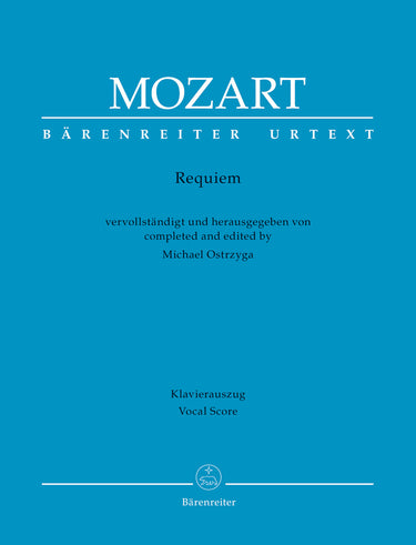 **Title**: Requiem | **Misc Information**: New Completion | **Composer / Author**: Mozart, Wolfgang Amadeus / Ostrzyga, Michael | **Editor**: Ostrzyga, Michael | **Edition Type**: Vocal Score, Urtext edition | **Instrumentation**: Soloists, Mixed choir (SATB), Orchestra | **Scoring/ Instrumentation**: Soprano solo, Alto solo, Tenor solo, Bass solo, Mixed choir (SATB), Orchestra | **Binding**: Paperback | **Printing**: 3rd printing 2024 | **Language of Text Part**: Latin | **Weight**: 475.0 g | **Format**: 27,0 x 19,0 cm | **Pages**: XIV, 151 S. | **Language**: EN | Sample: https://data.baerenreiter.com/NB/BA/BA11310_90_9790006569267_nb_lrg_01.jpg