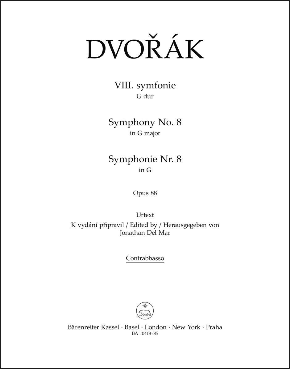 **Title**: Symphony no. 8 in G major op. 88 | **Composer / Author**: Dvorak, Antonin | **Editor**: Del Mar, Jonathan | **Edition Type**: Part, Urtext edition | **Scoring/ Instrumentation**: Double bass | **Binding**: Stapled | **Weight**: 51.0 g | **Format**: 32,5 x 25,5 cm | **Pages**: 12 S. | **Language**: EN | Sample: https://data.baerenreiter.com/NB/BA/BA10418_85_9790006564699_nb_lrg_01.jpg
