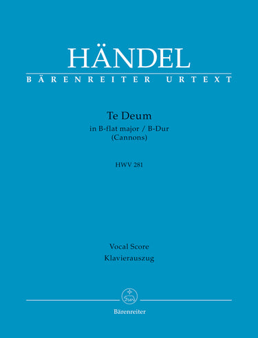 **Title**: Te Deum in B-flat major HWV 281 | **Misc Information**: Cannons | **Composer / Author**: Handel, George Frideric | **Arranger**: Köhs, Andreas | **Editor**: Beeks, Graydon | **Edition Type**: Vocal Score, Urtext edition | **Instrumentation**: Choir, Orchestra | **Binding**: Paperback | **Printing**: 1st printing 2018 | **Language of Text Part**: English | **Weight**: 311.0 g | **Format**: 27,0 x 19,0 cm | **Pages**: VII, 101 S. | **Language**: EN | Sample: https://data.baerenreiter.com/NB/BA/BA10708_90_9790006564507_nb_lrg_01.jpg