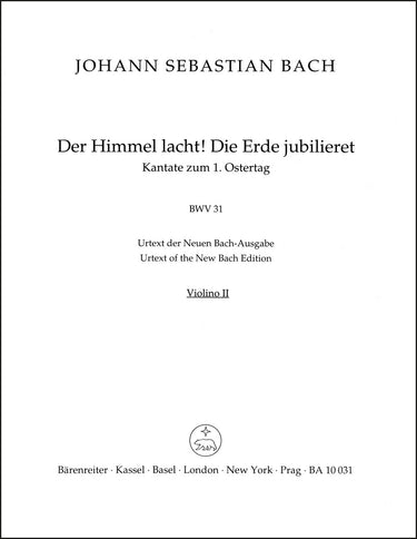 **Title**: The Heavens laugh, the earth exults in gladness BWV 31 | **Subtitle**: Cantata for the 1st Easter Day | **Comments on Version**: Study score = TP 1031 | **Composer / Author**: Bach, Johann Sebastian | **Editor**: Dürr, Alfred | **Edition Type**: Part, Urtext edition | **Scoring/ Instrumentation**: 2. Violin | **Binding**: Stapled | **Duration**: 00:23:00 | **Weight**: 30.0 g | **Format**: 22,5 x 16,5 cm | **Pages**: 5 S. | **Language**: EN | Sample: https://data.baerenreiter.com/NB/BA/BA10031_75_9790006503209_nb_lrg_01.jpg