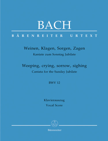 **Title**: Weeping, crying, sorrow, sighing BWV 12 | **Subtitle**: Cantata for the Sunday Jubilate | **Composer / Author**: Bach, Johann Sebastian | **Arranger**: Focke, Martin | **Editor**: Emans, Reinmar | **Edition Type**: Vocal Score, Urtext edition | **Binding**: Stapled | **Level of Difficulty**: 3.0 | **Duration**: 00:28:00 | **Printing**: 9th printing 2023 | **Language of Text Part**: German, English | **Weight**: 89.0 g | **Format**: 27,0 x 19,0 cm | **Pages**: 23 S. | **Language**: EN | Sample: https://data.baerenreiter.com/NB/BA/BA10012_90_9790006503179_nb_lrg_01.jpg