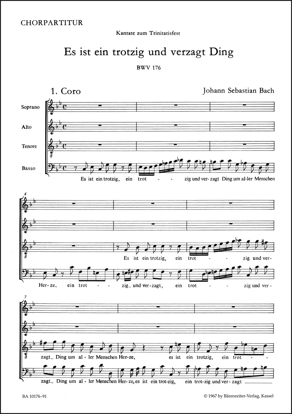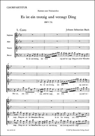 **Title**: Es ist ein trotzig und verzagt Ding BWV 176 | **Subtitle**: Cantata for Trinity Sunday | **Comments on Version**: Study score = TP 1176 | **Composer / Author**: Bach, Johann Sebastian | **Editor**: Freeman, Robert | **Edition Type**: Choral score, Urtext edition | **Scoring/ Instrumentation**: Mixed choir (SATB) | **Binding**: Stapled | **Language of Text Part**: German | **Weight**: 20.0 g | **Format**: 27,0 x 19,0 cm | **Pages**: 7 S. | **Language**: EN | Sample: https://data.baerenreiter.com/NB/BA/BA10176_91_9790006491704_nb_lrg_01.jpg
