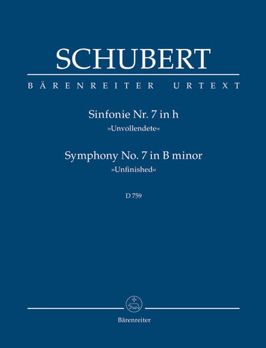 **Title**: Symphony no. 7 in B minor D 759 "Unfinished" | **Composer / Author**: Schubert, Franz | **Editor**: Aderhold, Werner | **Preface**: Aderhold, Werner | **Edition Type**: Study score, Urtext edition | **Instrumentation**: Orchestra | **Binding**: Paperback | **Duration**: 00:22:00 | **Printing**: 8th printing 2021 | **Weight**: 181.0 g | **Format**: 22,5 x 16,5 cm | **Pages**: VIII, 75 S. | **Language**: EN | Sample: https://data.baerenreiter.com/NB/TP/TP00407_00_9790006204472_nb_lrg_01.jpg