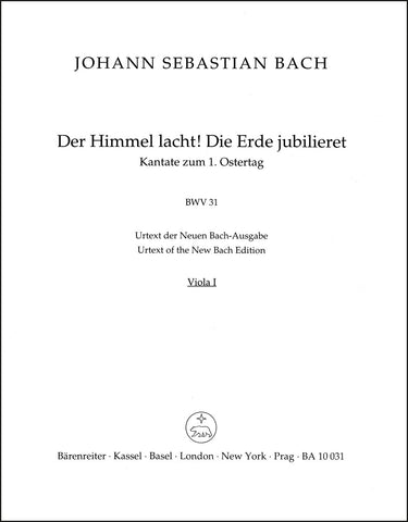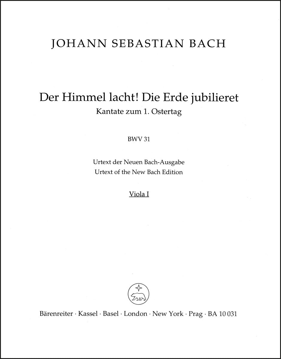 **Title**: The Heavens laugh, the earth exults in gladness BWV 31 | **Subtitle**: Cantata for the 1st Easter Day | **Comments on Version**: Study score = TP 1031 | **Composer / Author**: Bach, Johann Sebastian | **Editor**: Dürr, Alfred | **Edition Type**: Part, Urtext edition | **Scoring/ Instrumentation**: 1. Viola | **Binding**: Stapled | **Duration**: 00:23:00 | **Weight**: 30.0 g | **Format**: 32,5 x 25,5 cm | **Pages**: 5 S. | **Language**: EN | Sample: https://data.baerenreiter.com/NB/BA/BA10031_79_9790006503216_nb_lrg_01.jpg