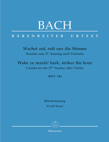 **Title**: Wake ye maids! hark, strikes the hour BWV 140 | **Subtitle**: Cantata for the 27th sunday after Trinity | **Comments**: Study score = TP 1140 | **Composer / Author**: Bach, Johann Sebastian | **Arranger**: Dürr, Alfred | **Editor**: Dürr, Alfred | **Edition Type**: Vocal Score, Urtext edition | **Binding**: Stapled | **Level of Difficulty**: 4.0 | **Duration**: 00:31:00 | **Printing**: 17th printing 2023 | **Language of Text Part**: German, English | **Weight**: 204.0 g | **Format**: 27,0 x 19,0 cm | **Pages**: IV, 62 S. | **Language**: EN | Sample: https://data.baerenreiter.com/NB/BA/BA10140_90_9790006491247_nb_lrg_01.jpg