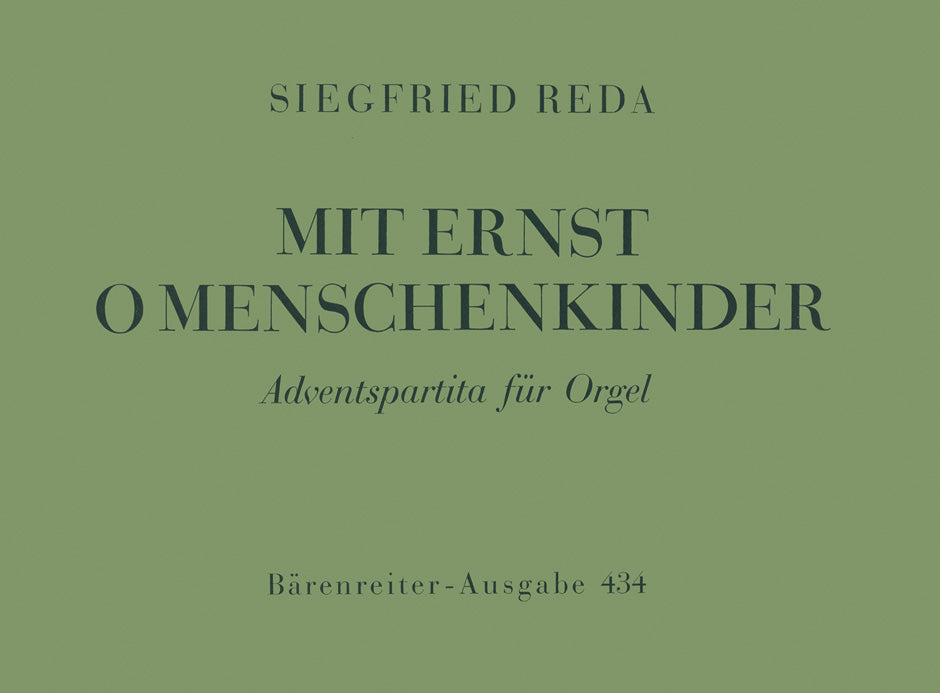 **Title**: Adventspartita "Mit Ernst, o Menschenkinder" (1952) | **Composer / Author**: Reda, Siegfried | **Edition Type**: Performance score | **Instrumentation**: Organ | **Scoring/ Instrumentation**: Organ | **Binding**: Stapled | **Level of Difficulty**: 3.0 | **Weight**: 106.0 g | **Format**: 24,0 x 32,5 cm | **Pages**: 31 S. | **Language**: EN | Sample: https://data.baerenreiter.com/NB/BA/BA00434_00_9790006402335_nb_lrg_01.jpg