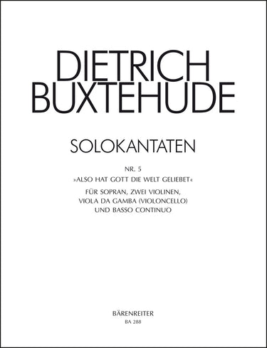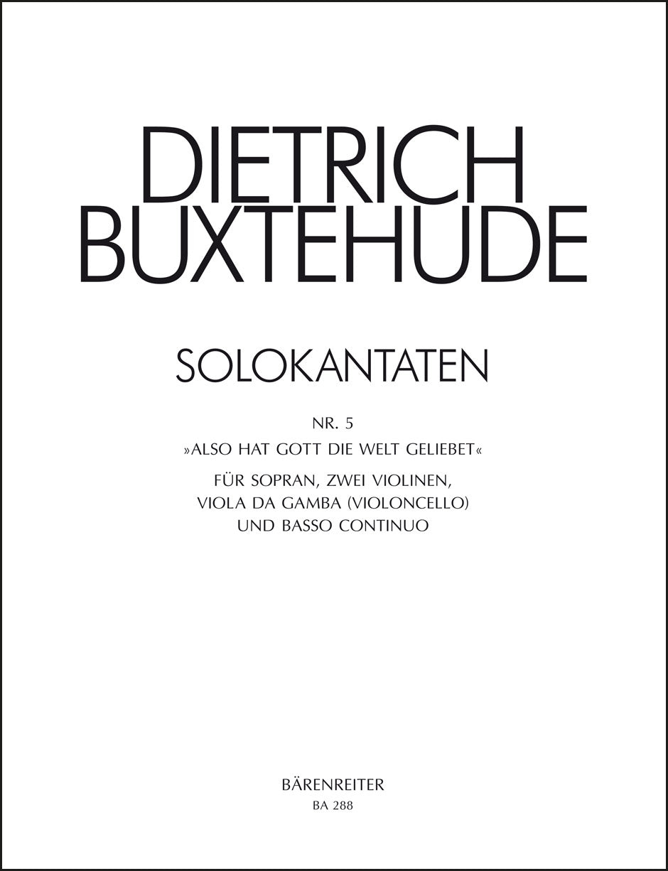 **Title**: Also hat Gott die Welt geliebet BuxWV 5 | **Subtitle**: Solokantate | **Composer / Author**: Buxtehude, Dietrich | **Editor**: Matthaei, Karl | **Edition Type**: Performance score, Set of parts | **Scoring/ Instrumentation**: Soprano solo, Violins (2), Viola da gamba (Violoncello), Basso continuo | **Binding**: Stapled | **Printing**: 12. Aufl. 2013 | **Language of Text Part**: German | **Weight**: 109.0 g | **Format**: 30,3 x 23,5 cm | **Pages**: 11/2/2/2/5/5 S. | **Language**: EN | Sample: https://data.baerenreiter.com/NB/BA/BA00288_00_9790006401291_nb_lrg_01.jpg