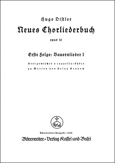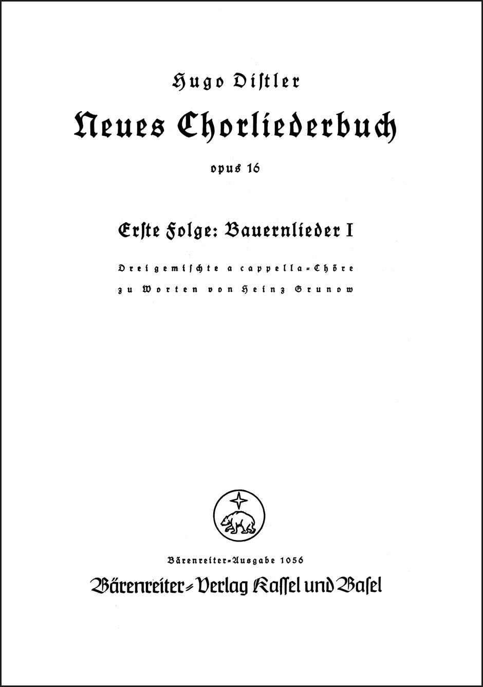 **Title**: Bauernlieder. Neues Chorliederbuch zu Worten von Hans Grunow op. 16/1 (1936/1938) | **Misc Information**: Folge 1 | **Composer / Author**: Distler, Hugo | **Libretto/Text by**: Grunow, Heinz | **Edition Type**: Choral score | **Instrumentation**: Choir | **Scoring/ Instrumentation**: Mixed choir (SATB) | **Binding**: Stapled | **Level of Difficulty**: 4.0 | **Weight**: 27.0 g | **Format**: 29,7 x 21,0 cm | **Pages**: 7 S. | **Language**: EN | Sample: https://data.baerenreiter.com/NB/BA/BA01056_00_9790006407873_nb_lrg_01.jpg