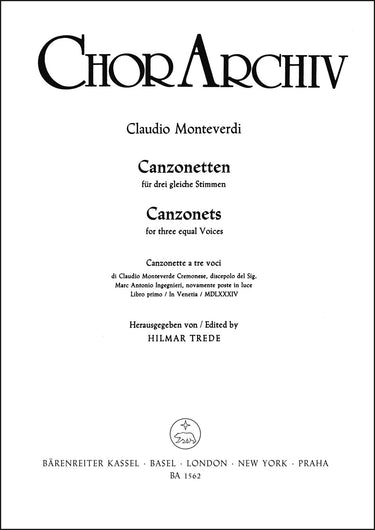 **Title**: Canzonetten | **Composer / Author**: Monteverdi, Claudio | **Editor**: Trede, Hilmar | **Edition Type**: Choral score, Anthology | **Instrumentation**: Female choir | **Scoring/ Instrumentation**: Female choir (SSA) | **Binding**: Stapled | **Level of Difficulty**: 3.0 | **Printing**: 13. Aufl. 2017 | **Language of Text Part**: Italian, German | **Weight**: 41.0 g | **Format**: 27,0 x 19,0 cm | **Pages**: 16 S. | **Language**: EN | Sample: https://data.baerenreiter.com/NB/BA/BA01562_00_9790006411764_nb_lrg_01.jpg