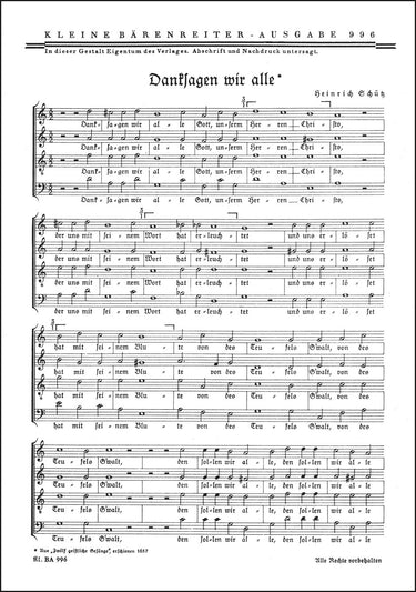 **Title**: Danksagen wir alle Gott SWV 425 | **Subtitle**: Psalm 111. Kleine Motette | **Misc Information**: aus "Zwölf geistliche Gesänge" | **Composer / Author**: Schutz, Heinrich | **Edition Type**: Choral score | **Instrumentation**: Choir | **Scoring/ Instrumentation**: Mixed choir (SATB) | **Binding**: Stapled | **Level of Difficulty**: 3.0 | **Weight**: 4.0 g | **Pages**: 2 S. | **Language**: EN | Sample: https://data.baerenreiter.com/NB/BA/BA00996_00_9790006407262_nb_lrg_01.jpg