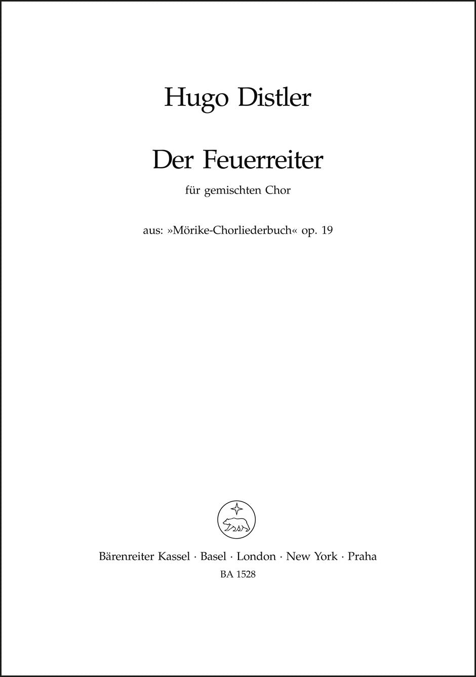 **Title**: Der Feuerreiter (Sehet ihr am Fensterlein dort die rote Mütze wieder?) | **Misc Information**: aus "Mörike-Chorliederbuch" op. 19 | **Composer / Author**: Distler, Hugo | **Libretto/Text by**: Mörike, Eduard | **Edition Type**: Choral score | **Instrumentation**: Choir | **Scoring/ Instrumentation**: Mixed choir: SSAATB | **Binding**: Stapled | **Level of Difficulty**: 4.0 | **Weight**: 41.0 g | **Format**: 27,0 x 19,0 cm | **Pages**: 14 S. | **Language**: EN | Sample: https://data.baerenreiter.com/NB/BA/BA01528_00_9790006411375_nb_lrg_01.jpg