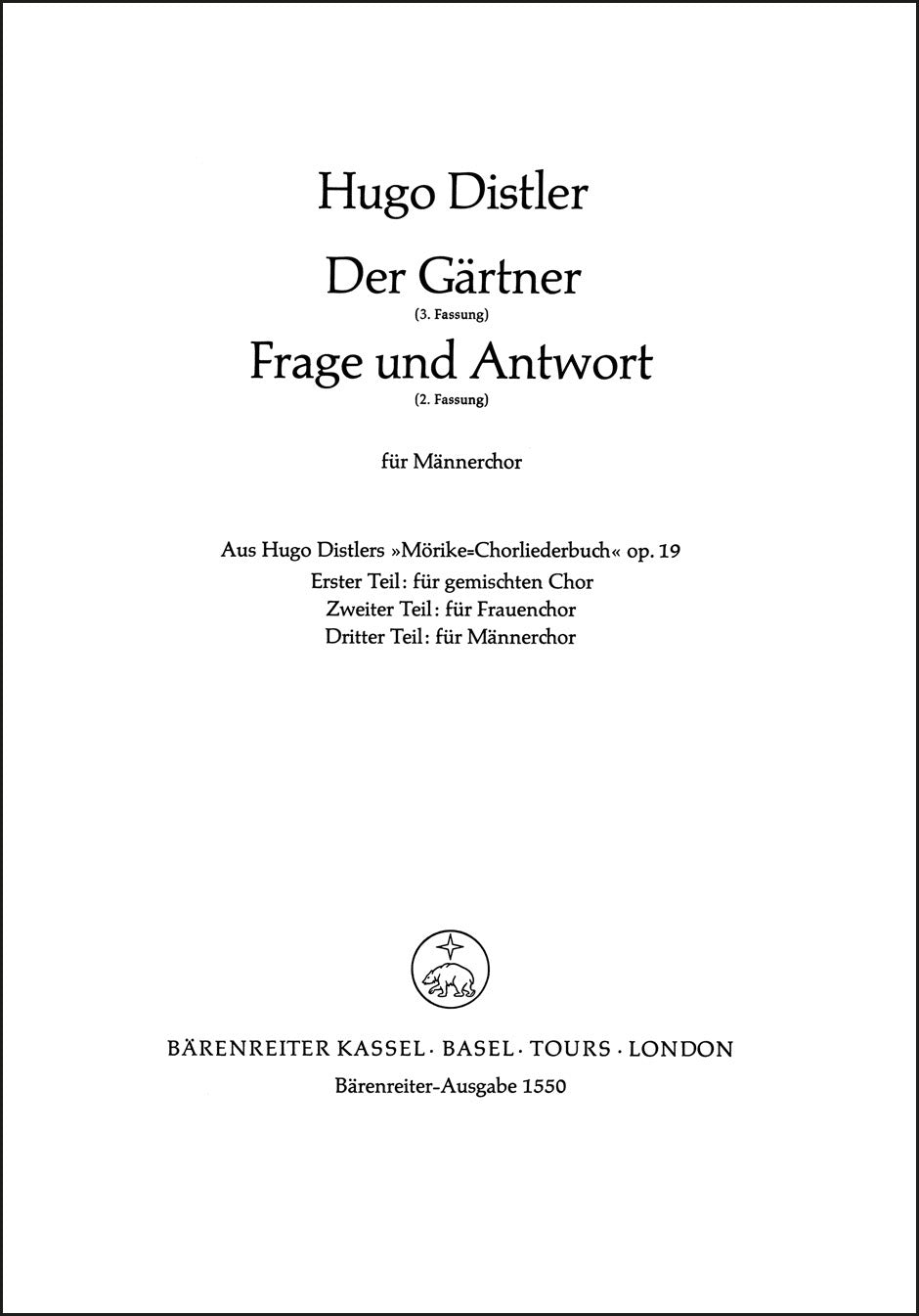 **Title**: Der Gärtner (Auf ihrem Leibrößlein, TTB). 3. Fassung - Frage und Antwort (Fragst du mich, woher die bange Liebe, TB). 2. Fassung | **Misc Information**: aus "Mörike-Chorliederbuch" op. 19 | **Composer / Author**: Distler, Hugo | **Libretto/Text by**: Mörike, Eduard | **Edition Type**: Choral score | **Instrumentation**: Male choir | **Scoring/ Instrumentation**: Male choir | **Binding**: Stapled | **Level of Difficulty**: 3.0 | **Weight**: 9.0 g | **Pages**: 3 S. | **Language**: EN | Sample: https://data.baerenreiter.com/NB/BA/BA01550_00_9790006411597_nb_lrg_01.jpg