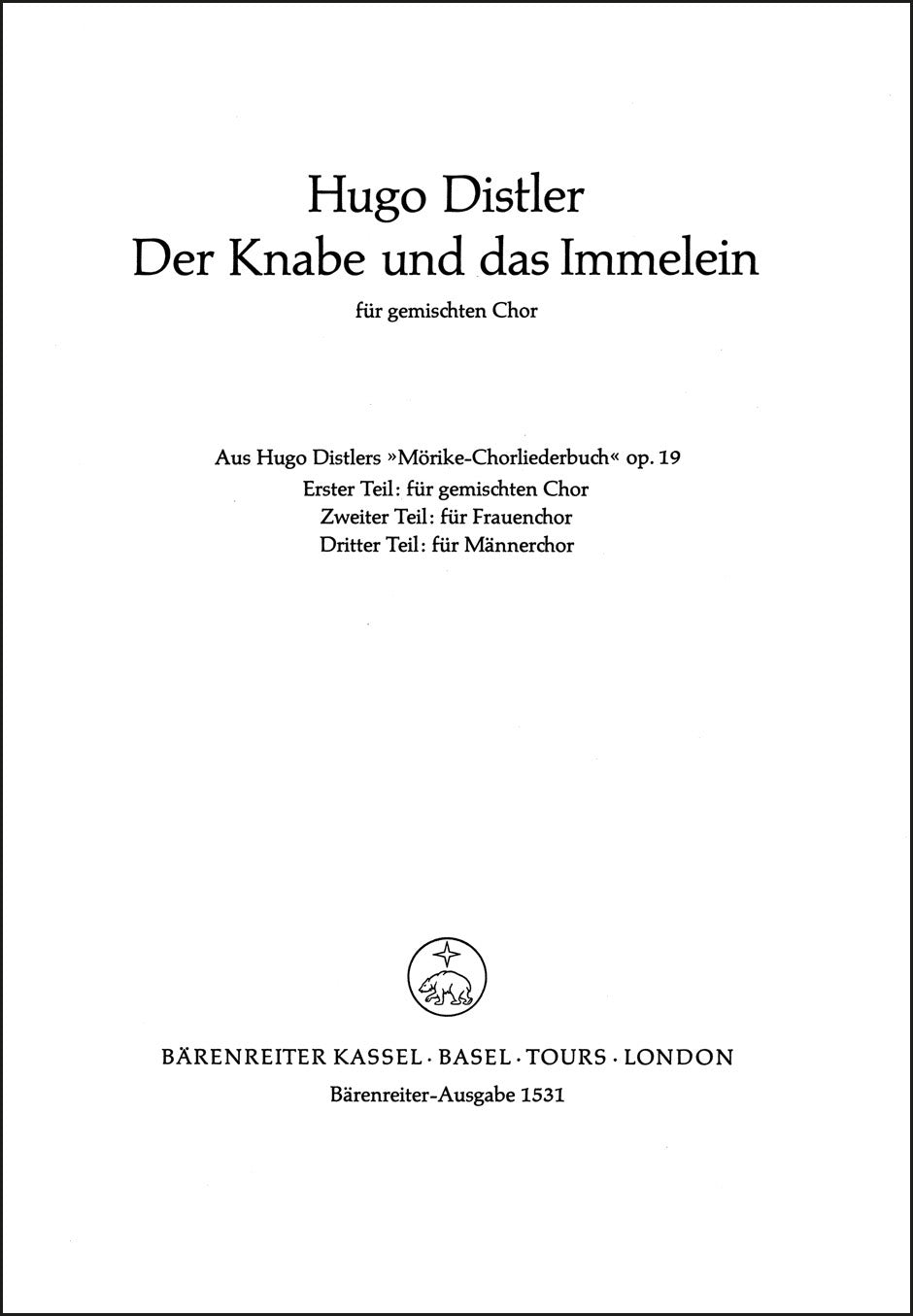 **Title**: Der Knabe und das Immelein (Im Weinberg auf der Höhe) | **Misc Information**: aus "Mörike-Chorliederbuch" op. 19 | **Composer / Author**: Distler, Hugo | **Libretto/Text by**: Mörike, Eduard | **Edition Type**: Choral score | **Instrumentation**: Choir | **Scoring/ Instrumentation**: Mixed choir (SATB) | **Binding**: Stapled | **Level of Difficulty**: 3.0 | **Weight**: 20.0 g | **Format**: 27,0 x 19,0 cm | **Pages**: 8 S. | **Language**: EN | Sample: https://data.baerenreiter.com/NB/BA/BA01531_00_9790006411405_nb_lrg_01.jpg