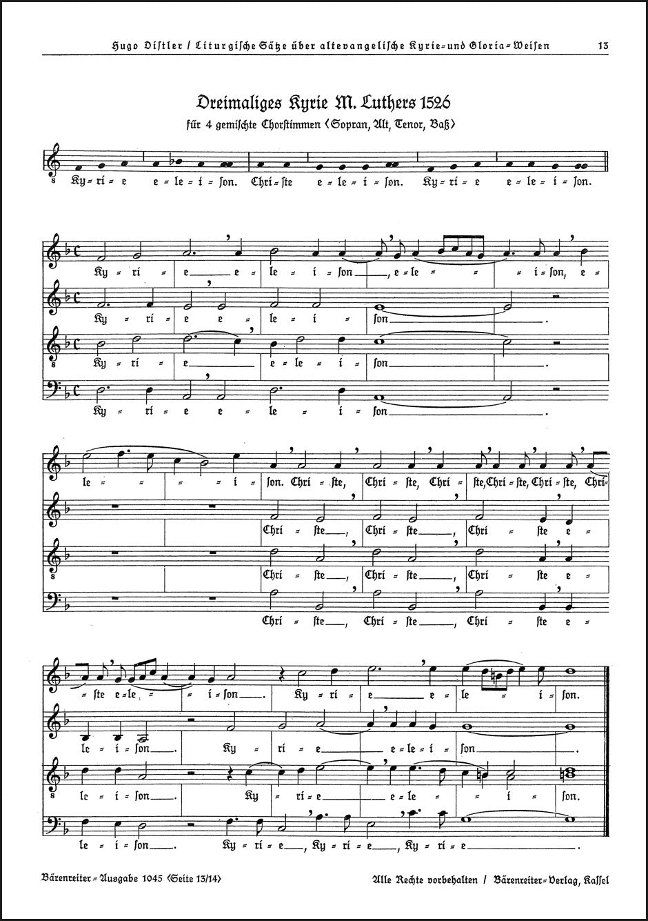 **Title**: Dreimaliges Kyrie Martin Luthers 1526 (SATB) / Dreimaliges Kyrie Nürnberg 1525 (SATB) | **Misc Information**: 2 Sätze aus "Liturgische Sätze über altevangelische Kyrie- und Gloriaweisen" op. 13 (1933/35) | **Composer / Author**: Distler, Hugo | **Edition Type**: Choral score | **Instrumentation**: Choir | **Scoring/ Instrumentation**: Mixed choir (SATB) | **Binding**: Stapled | **Level of Difficulty**: 3.0 | **Weight**: 4.0 g | **Pages**: 2 S. | **Language**: EN | Sample: https://data.baerenreiter.com/NB/BA/BA01045_00_9790006407767_nb_lrg_01.jpg