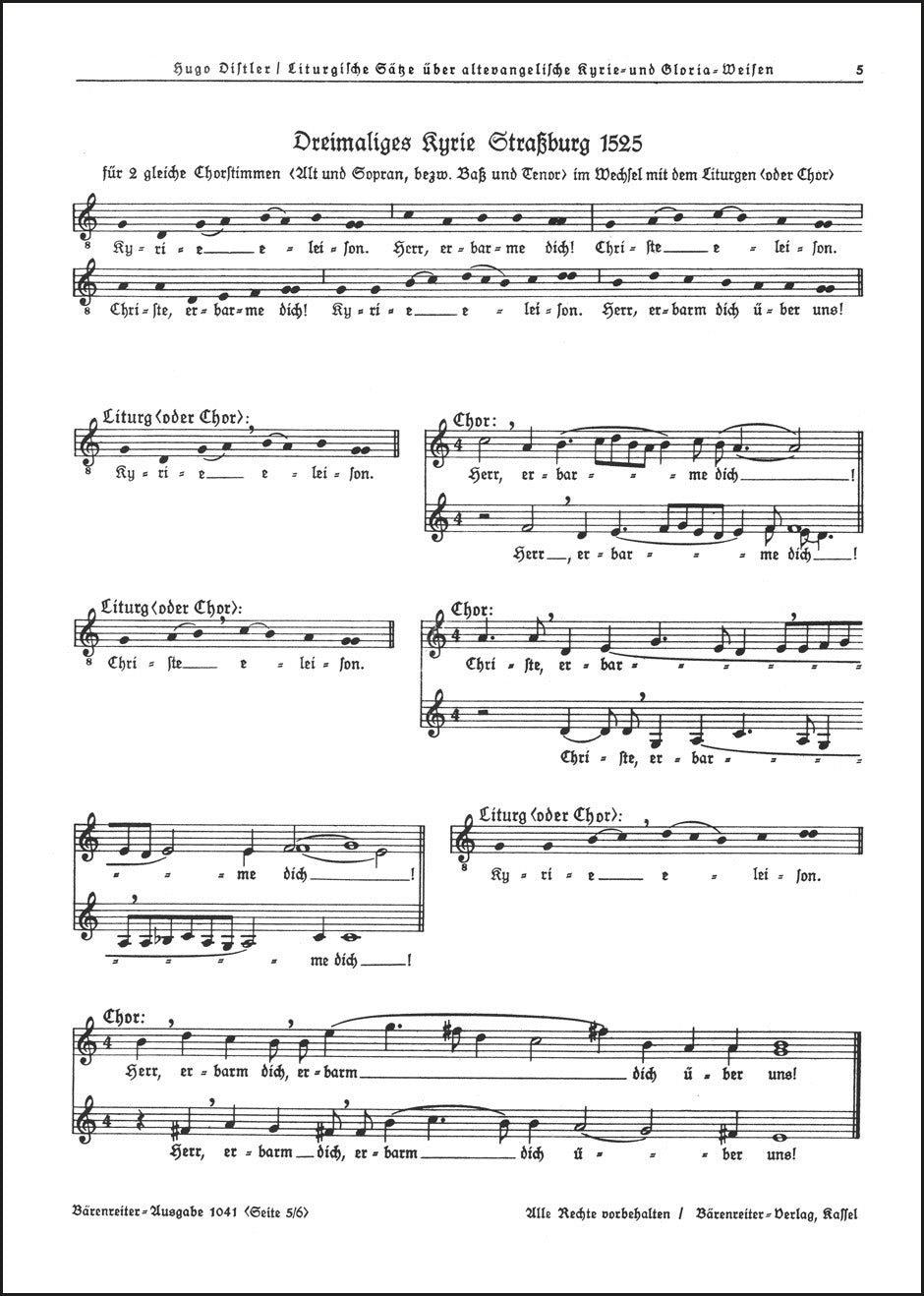 **Title**: Dreimaliges Kyrie, Straßburg 1525 / Kyrie minus summum 1612 | **Misc Information**: 2 Sätze aus "Liturgische Sätze über altevangelische Kyrie- und Gloriaweisen" op. 13 (1933/35) | **Composer / Author**: Distler, Hugo | **Edition Type**: Choral score | **Instrumentation**: Female choir | **Scoring/ Instrumentation**: Female choir (SA) | **Binding**: Stapled | **Level of Difficulty**: 3.0 | **Weight**: 4.0 g | **Format**: 27,0 x 19,0 cm | **Pages**: 2 S. | **Language**: EN | Sample: https://data.baerenreiter.com/NB/BA/BA01041_00_9790006407729_nb_lrg_01.jpg