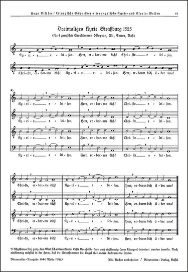**Title**: Dreimaliges Kyrie Straßburg 1525 (SATB) / Dreimaliges Kyrie Nürnberg 1525 (SATB) / Dreimaliges Kyrie Martin Luthers 1526 (SATB) | **Misc Information**: 3 Sätze aus "Liturgische Sätze über altevangelische Kyrie- und Gloriaweisen" op. 13 (1933/35) | **Composer / Author**: Distler, Hugo | **Edition Type**: Choral score | **Instrumentation**: Choir | **Scoring/ Instrumentation**: Mixed choir (SATB) | **Binding**: Stapled | **Level of Difficulty**: 3.0 | **Weight**: 4.0 g | **Pages**: 2 S. | **Language**: EN | Sample: https://data.baerenreiter.com/NB/BA/BA01044_00_9790006407750_nb_lrg_01.jpg