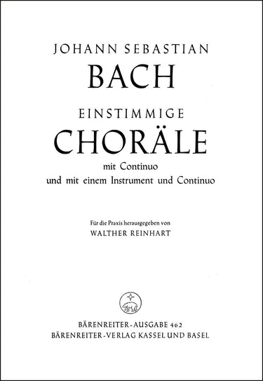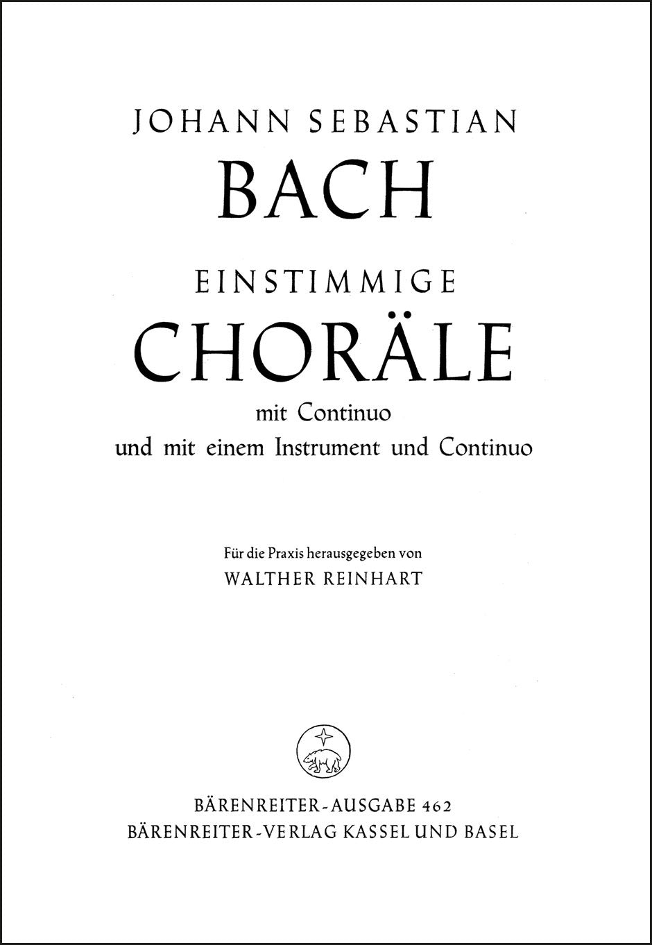 **Title**: Einstimmige Choräle aus den Kantaten, Heft 1 | **Subtitle**: 7 Choralkompositionen für Solostimme oder Chor, teilweise mit obligaten Instrumenten | **Composer / Author**: Bach, Johann Sebastian | **Editor**: Reinhart, Walther | **Edition Type**: Score | **Scoring/ Instrumentation**: Singing voice, Instrument, Basso continuo | **Binding**: Stapled | **Weight**: 96.0 g | **Format**: 27,0 x 19,1 cm | **Pages**: 41 S. | **Language**: EN | Sample: https://data.baerenreiter.com/NB/BA/BA00462_00_9790006402564_nb_lrg_01.jpg