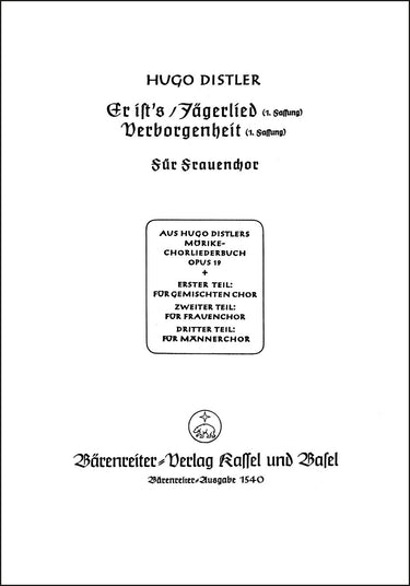 **Title**: Er ist's / Jägerlied / Verborgenheit | **Misc Information**: aus "Mörike-Chorliederbuch" op. 19 | **Composer / Author**: Distler, Hugo | **Libretto/Text by**: Mörike, Eduard | **Edition Type**: Choral score | **Instrumentation**: Female choir | **Scoring/ Instrumentation**: Female choir | **Binding**: Stapled | **Weight**: 9.0 g | **Pages**: 4 S. | **Language**: EN | Sample: https://data.baerenreiter.com/NB/BA/BA01540_00_9790006411498_nb_lrg_01.jpg