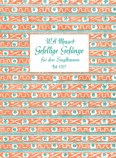 **Title**: Gesellige Gesänge | **Composer / Author**: Mozart, Wolfgang Amadeus | **Libretto/Text by**: Paumgartner, Bernhard | **Edition Type**: Singing Score, Anthology | **Instrumentation**: Singing voice, Piano | **Scoring/ Instrumentation**: 3 Singing voices, Piano | **Binding**: Paperback | **Printing**: 12. Aufl. 2011 | **Weight**: 166.0 g | **Format**: 27,0 x 19,0 cm | **Pages**: V, 48 S. | **Language**: EN | Sample: https://data.baerenreiter.com/NB/BA/BA01767_00_9790006413980_nb_lrg_01.jpg