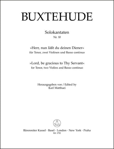 **Title**: Herr, nun läßt du deinen Diener (Lord, be gracious to Thy servant) | **Subtitle**: Solokantate 10 | **Composer / Author**: Buxtehude, Dietrich | **Editor**: Matthaei, Karl | **Preface**: Matthaei, Karl | **Edition Type**: Score, Set of parts | **Scoring/ Instrumentation**: Tenor solo, Violins (2), Basso continuo | **Binding**: Stapled | **Printing**: 6. Aufl. 2021 | **Language of Text Part**: German, English | **Weight**: 82.0 g | **Format**: 30,0 x 23,0 cm | **Pages**: 12/3/3/4 S. | **Language**: EN | Sample: https://data.baerenreiter.com/NB/BA/BA01752_00_9790006413843_nb_lrg_01.jpg