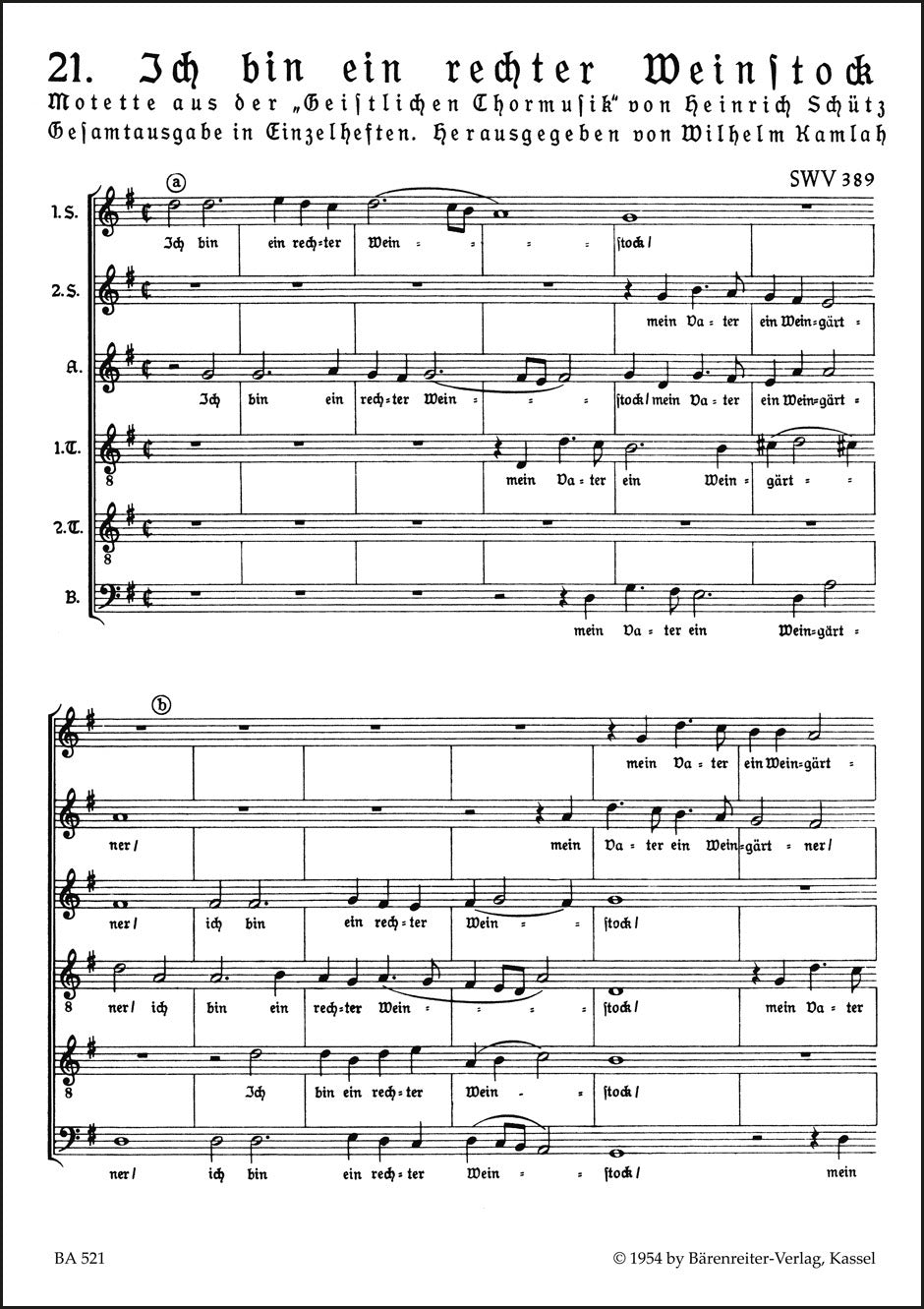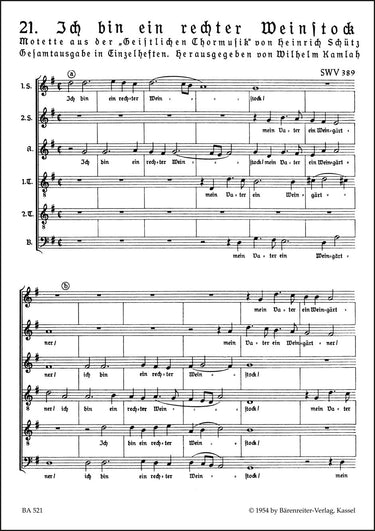 **Title**: Ich bin ein rechter Weinstock SWV 389 | **Subtitle**: Motet | **Misc Information**: no. 21 from "Geistliche Chormusik 1648" | **Composer / Author**: Schutz, Heinrich | **Editor**: Kamlah, Wilhelm | **Edition Type**: Choral score, Urtext edition | **Instrumentation**: Choir, Basso continuo | **Scoring/ Instrumentation**: Mixed choir: SSATB, Basso continuo ad libitum | **Binding**: Stapled | **Level of Difficulty**: 3.0 | **Printing**: 17th printing 2014 | **Weight**: 19.0 g | **Format**: 27,0 x 19,0 cm | **Pages**: 8 S. | **Language**: EN | Sample: https://data.baerenreiter.com/NB/BA/BA00521_00_9790006403189_nb_lrg_01.jpg
