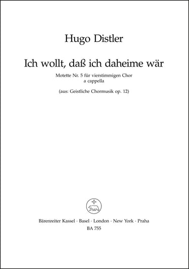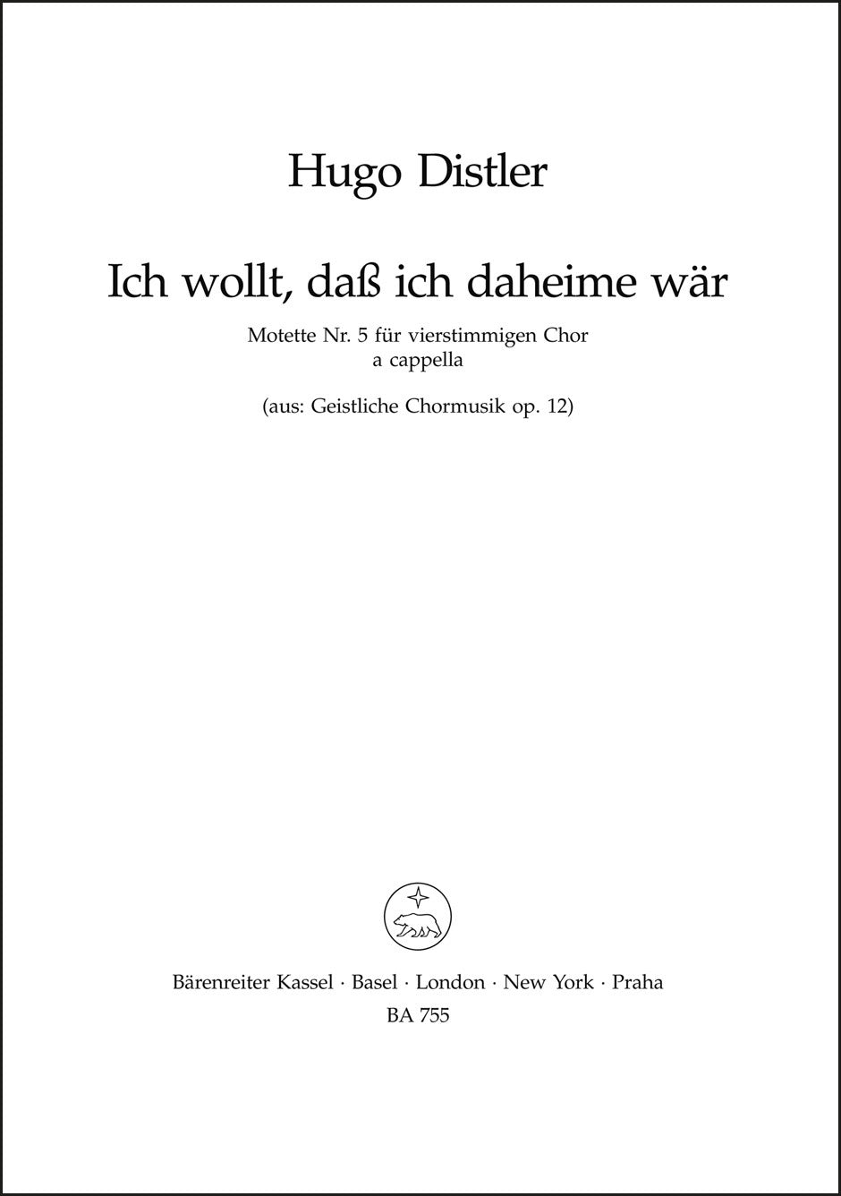 **Title**: Ich wollt, daß ich daheime wär für vierstimmigen Chor a cappella no. 5 | **Subtitle**: Motette zum Totensonntag | **Misc Information**: aus Geistliche Chormusik (1934-1941) op. 12 | **Comments**: Frakturschrift | **Composer / Author**: Distler, Hugo | **Edition Type**: Choral score | **Instrumentation**: Choir | **Scoring/ Instrumentation**: Mixed choir (SATB) | **Binding**: Stapled | **Level of Difficulty**: 3.0 | **Printing**: 20. Aufl. 2022 | **Weight**: 21.0 g | **Format**: 27,0 x 19,0 cm | **Pages**: 7 S. | **Language**: EN | Sample: https://data.baerenreiter.com/NB/BA/BA00755_00_9790006405206_nb_lrg_01.jpg