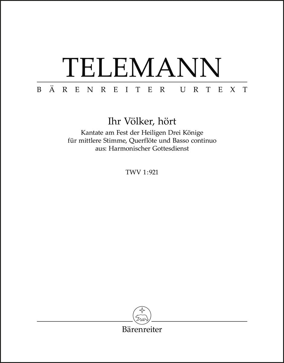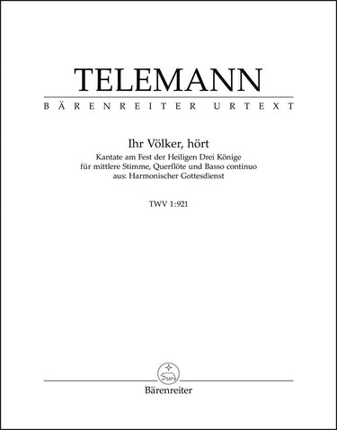 **Title**: Ihr Völker, hört TWV 1:921 | **Subtitle**: Kantate am Fest der Heiligen Drei Könige | **Misc Information**: aus "Harmonischer Gottesdienst" | **Composer / Author**: Telemann, Georg Philipp | **Editor**: Fock, Gustav | **Edition Type**: Score, Set of parts, Urtext edition | **Instrumentation**: Flute, Basso continuo | **Scoring/ Instrumentation**: Medium voice, Flute, Basso continuo | **Binding**: Stapled | **Level of Difficulty**: 3.0 | **Language of Text Part**: German | **Weight**: 158.0 g | **Format**: 31,0 x 24,0 cm | **Pages**: 14/4/3/6 S. | **Language**: EN | Sample: https://data.baerenreiter.com/NB/BA/BA00387_00_9790006402281_nb_lrg_01.jpg