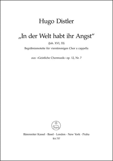 **Title**: In der Welt habt ihr Angst no. 7 | **Subtitle**: Begräbnismotette | **Misc Information**: aus "Geistliche Chormusik" op. 12 (1934-1941) | **Composer / Author**: Distler, Hugo | **Edition Type**: Choral score | **Instrumentation**: Choir | **Scoring/ Instrumentation**: Mixed choir (SATB) | **Binding**: Stapled | **Level of Difficulty**: 3.0 | **Printing**: 16. Aufl. 2022 | **Weight**: 10.0 g | **Format**: 27,0 x 19,0 cm | **Pages**: 4 S. | **Language**: EN | Sample: https://data.baerenreiter.com/NB/BA/BA00757_00_9790006405220_nb_lrg_01.jpg