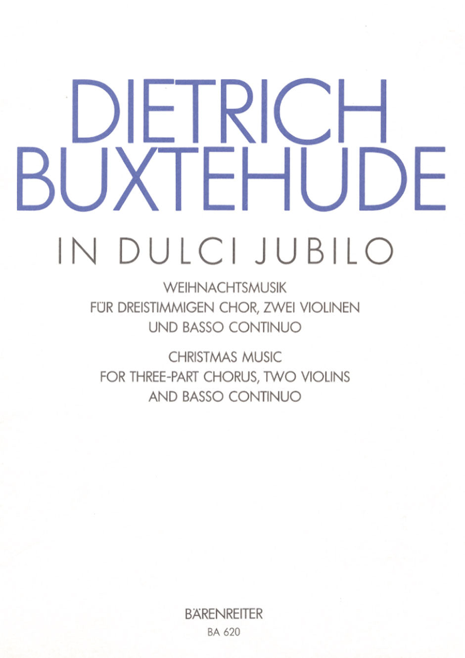 **Title**: In dulci jubilo for three-part Chorus, two Violins and Basso continuo BuxWV 52 | **Subtitle**: Christmas Music | **Comments on Version**: Violino I/II: 2 copies included | **Composer / Author**: Buxtehude, Dietrich | **Editor**: Grusnick, Bruno | **Edition Type**: Score, Set of parts | **Scoring/ Instrumentation**: Mixed choir: SAB, Violins (2), Basso continuo (Violoncello) | **Binding**: Stapled | **Level of Difficulty**: 2.0 | **Printing**: 25th printing 2021 | **Language of Text Part**: German, English | **Weight**: 71.0 g | **Format**: 27,0 x 19,0 cm | **Pages**: 15/3/3/3 S. | **Language**: EN | Sample: https://data.baerenreiter.com/NB/BA/BA00620_00_9790006403974_nb_lrg_01.jpg