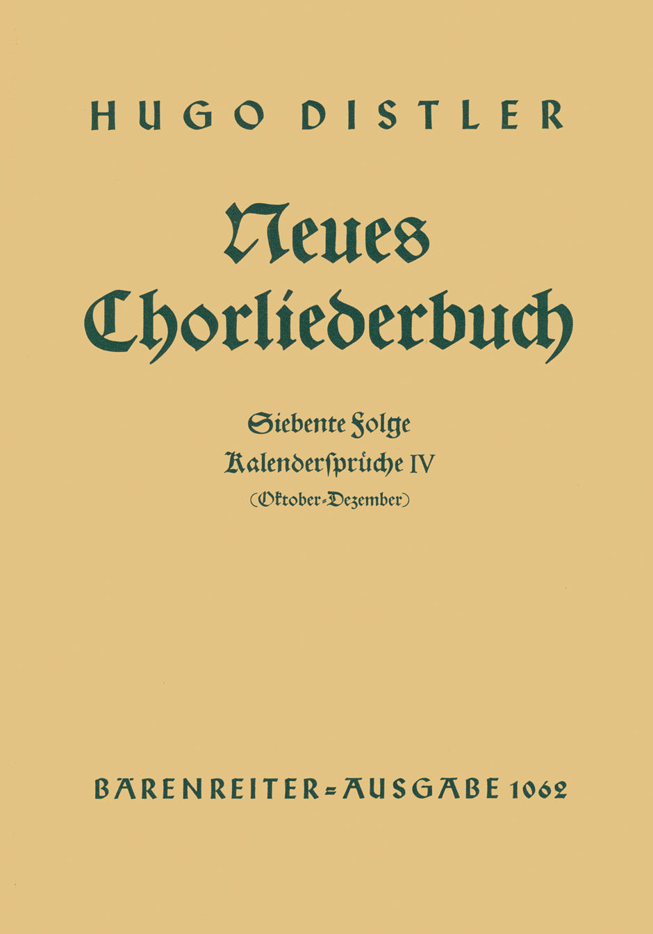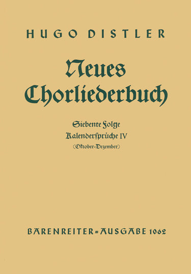 **Title**: Kalendersprüche IV (Oktober - Dezember). Neues Chorliederbuch zu Worten von Hans Grunow op. 16/7 (1936/1938) | **Misc Information**: Folge 7 | **Composer / Author**: Distler, Hugo | **Libretto/Text by**: Grunow, Heinz | **Edition Type**: Choral score | **Instrumentation**: Choir | **Scoring/ Instrumentation**: Mixed choir | **Binding**: Stapled | **Level of Difficulty**: 4.0 | **Weight**: 59.0 g | **Format**: 27,0 x 19,0 cm | **Pages**: 19 S. | **Language**: EN | Sample: https://data.baerenreiter.com/NB/BA/BA01062_00_9790006407934_nb_lrg_01.jpg