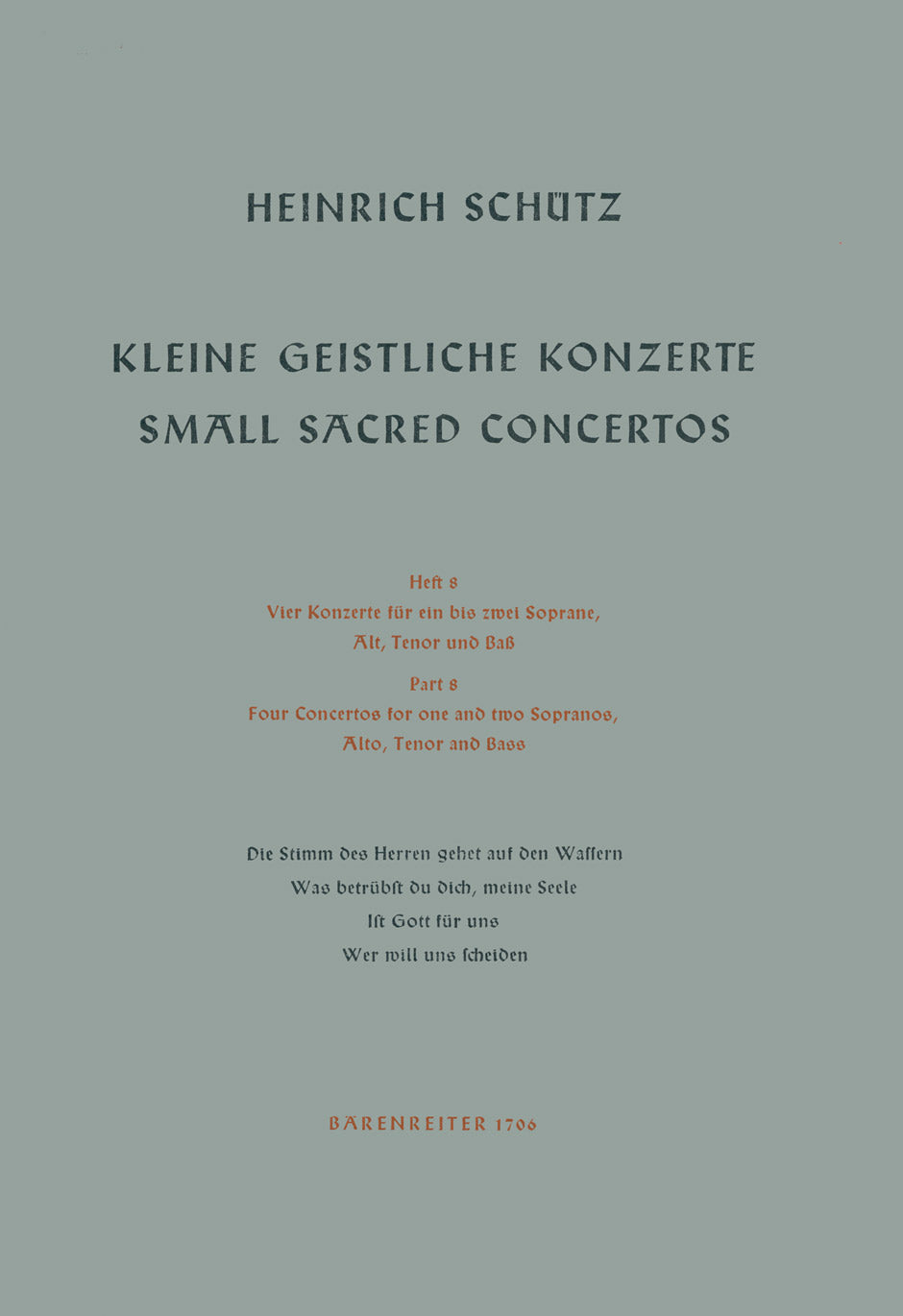 **Title**: Kleine geistliche Konzerte, Heft 8 | **Comments on Version**: Der Partitur liegt die Stimme für ein Continuo-Instrument bei | **Composer / Author**: Schutz, Heinrich | **Editor**: Ehmann, Wilhelm | **Edition Type**: Singing Score, Part, Anthology, Urtext edition | **Scoring/ Instrumentation**: Singing voice, Basso continuo | **Binding**: Stapled | **Level of Difficulty**: 3.0 | **Weight**: 126.0 g | **Format**: 20,0 x 21,0 cm | **Pages**: 36/4 S. | **Language**: EN | Sample: https://data.baerenreiter.com/NB/BA/BA01706_00_9790006412778_nb_lrg_01.jpg